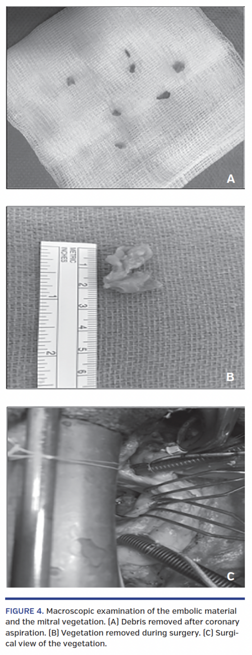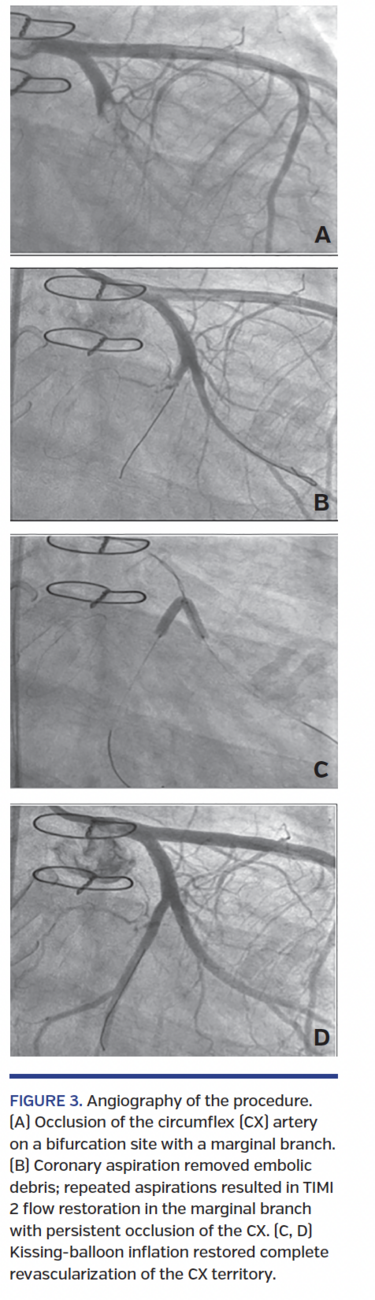 Stent implantation into an infected site can lead to the formation of a mycotic coronary aneurysm.19,29 These aneurysms can also form as the angioplasty balloon crushes the septic embolism against the vessel wall.12 The surgical option has the benefit of allowing tissue debridement, valve replacement, and a coronary artery bypass. Nevertheless, it is challenging to perform urgent surgical revascularization in the setting of ST-segment elevation myocardial infarction, and this option is not possible in a hospital without cardiac surgery. It must be favored when there is not a complete occlusion of the vessel. Thromboaspiration with a large catheter may be the optimal technique when it allows a complete blood flow restoration. Unfortunately, when a complete resolution of the stenosis is not possible with aspiration alone, balloon angioplasty and/or stent implantation must be discussed. However, manual thrombectomy technique presents its own complications, with an increased rate of stroke.30