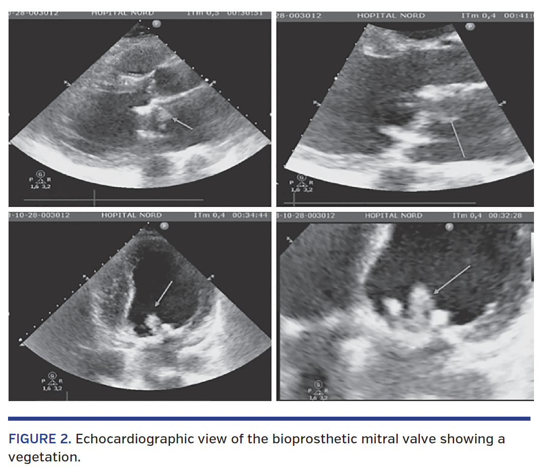 Given the episodic fever, we rapidly performed an echocardiography before cardiac catheterization that showed a 2 cm irregular mobile formation attached to the bioprosthetic mitral valve (Figure 2) and an impaired left ventricular ejection fraction of 35% with akinesis of the inferior and inferolateral walls.