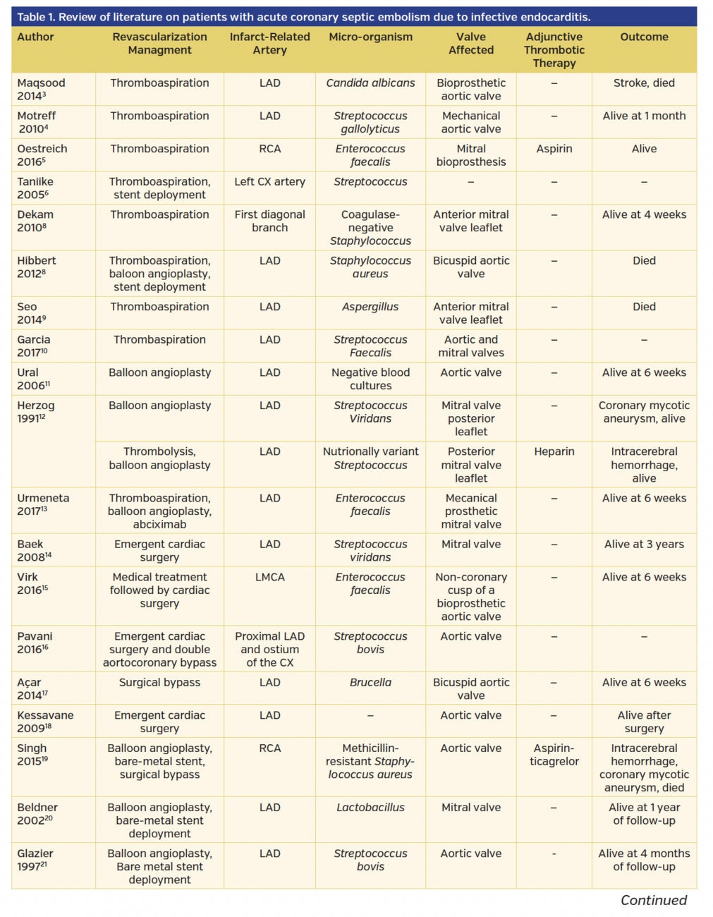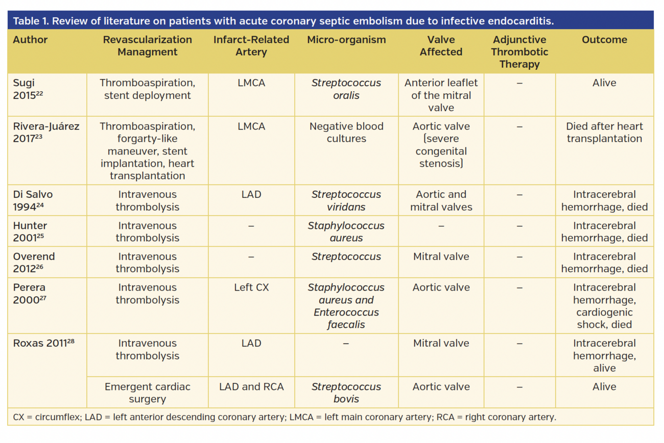 Acute coronary syndromes are a rare complication occurring in 1.9% of infective endocarditis.2 There is a lack of clear data available concerning the best treatment for patients with acute coronary septic embolism due to infective endocarditis. We therefore performed a review of previous cases and summarized their clinical features and management (Table 1). Several revascularization strategies have been reported in the literature, such as thromboaspiration,3-10 balloon angioplasty,11-13 bypass surgery or surgical embolectomy,14-18 stent implantation,19-23 and even thrombolysis,24-28 with inconsistent results.