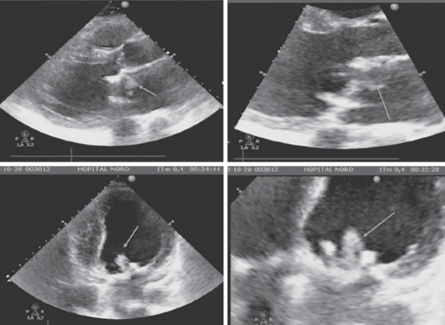 Adjunctive therapy, such as heparin and antiplatelet agent, is also a major concern. There are no data concerning this strategy, but it may be chosen bearing in mind that a surgical valve replacement will be necessary in most cases. Also, several patients are at risk of hemorrhagic complications (especially in a cerebral location), making the choice even more difficult. However, the pharmacological therapy must take into account both bleeding risk and thrombotic risk, depending on the acute presentation.