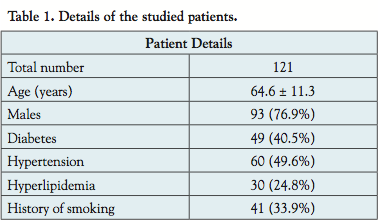 A total of 121 patients were included in this analysis (mean age, 64.6 ± 11.3 years; 77% male). Patient details were shown in Table 1. According to the Fontaine classification, 99 patients (81%) were classified as stage IIb, 8 patients (7%) as stage III and 14 patients (12%) as stage IV. All of the patients underwent a therapeutic procedure of the lower limbs (percutaneous transluminal angioplasty [PTA] and stenting in 82 patients; PTA only in 20 patients; other interventions including rotational ablation and a combination in 19 patients).