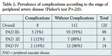 Moreover, in our study, there was a trend toward increased complication rates with higher stages of PAD. However, these findings were limited by the small number of patients with a stage III and IV PAD, with most of the patients considered to be stage IIb. Studies with larger numbers of patients with higher stages of PAD are needed to confirm our results. A further limitation of our study is the absence of a control group and the small sample size.