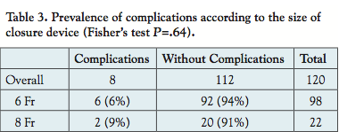 The association of PAD stage with complication rates is shown in Table 2. There was a trend toward higher frequency of complications with higher stages of PAD without reaching statistical significance (PAD stage IIb, 5%; stage III, 12%; stage IV, 14%; P=.20). Likewise, complication rates were higher using 8 Fr sheaths compared to 6 Fr sheaths, again without reaching statistical significance (6 Fr, 6.1%; 8 Fr, 9.1%; P=.63) (Table 3).