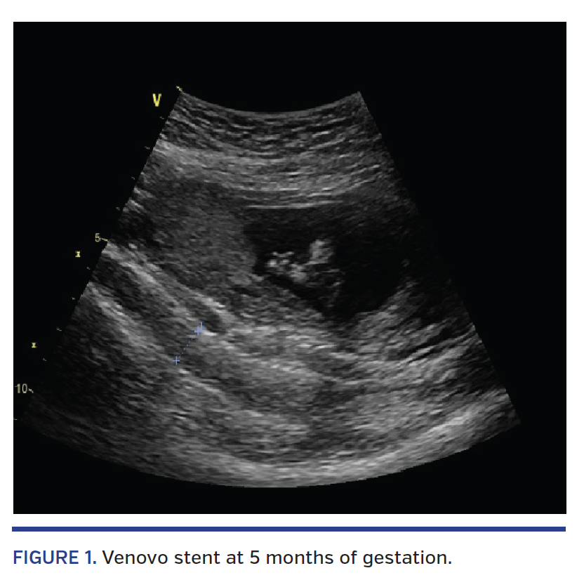The patient is a young female who presented with debilitating left leg pain. Computed tomography angiography of the abdomen and pelvis revealed a severe compression of the left common iliac vein by her right common iliac artery. The patient underwent venography and intravascular ultrasound to her left iliac veins. The left common iliac vein was severely compressed by the right common iliac artery with luminal area stenosis ranging from 80% to 90% when compared with the ipsilateral distal left common iliac vein reference. Stenting was carried out using an 18 x 60 mm Venovo venous stent. Repeat duplex ultrasound at 5 months into her pregnancy (Figure 1) showed no evidence of iliac vein compression and the stent was widely patent. At 33.5 weeks into her pregnancy, another duplex ultrasound was performed (Figure 2) and showed no evidence of stent compression by the gravid uterus and good flow. Computed tomography scan of the pelvis with venous filling was performed 2 years after her pregnancy. The stent was widely patent with no restenosis, thrombosis, compression, or deformation and with optimal positioning (Figure 2).