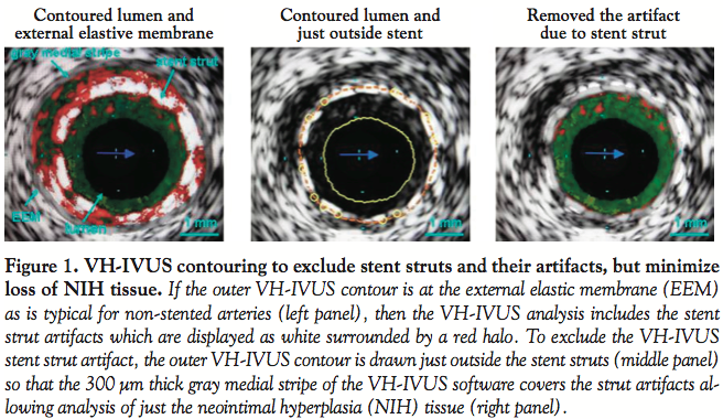 Methodologic considerations. The assessment of plaque composition after stent implantation by VH-IVUS has the problem of stent strut artifact.11 VH-IVUS classified plaque between inner and outer contours. If the outer VH-IVUS contour is drawn at the external elastic membrane and the inner contour is drawn at the lumen, the plaque area between the inner and outer contour would include all of the stent struts (as well as the persistent plaque and NIH) whose artifacts increase the % dense calcium and NC (Figure 1). On the other hand, if the outer VH-IVUS contour is drawn within the stent struts to exclude the stent strut artifact, then a significant amount of NIH would be lost because it would be “covered” by the 300 µm thick, software-imposed gray medial stripe. Therefore, we hit on the novel approach to use the 300 µm thick, software-imposed gray medial stripe to our advantage by drawing the outer contour so that the gray medial stripe covered the stent strut artifacts, but not the NIH. Thus, this method for assessment of NIH within stent struts removes the strut artifact completely while minimizing loss of NIH. This is shown in Figure 1.