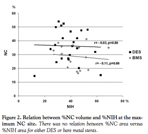 Statistical analysis. Statistical analysis was performed with SAS version 9.1 (SAS Institute, Cary, North Carolina). Comparison of continuous variables was performed with non parametric Mann Whitney U test. Values were presented as median, interquartile range. Categorical variables were analyzed with Fisher’s exact test or chi square test as appropriate. Spearman bivariate correlation analysis was performed between time and % NIH volume or between % NIH and % NC area. Multivariable linear regression analysis was used to determine the predictors of % NC volume. Variables associated with p < 0.20 in Spearman bivariate correlation analysis were included in the regression model. Variables tested were DES, patient age, sex, diabetes mellitus, systemic hypertension, dyslipidemia, smoking, stent age, clinical indication for stent implantation at the index procedure (acute coronary syndrome - Y/N), lesion location, malapposition, stent overlap, and medication before admission (aspirin, clopidogrel, ß-blocker, angiotensin-converting enzyme inhibitor/angiotensin II antagonist, calcium-channel blocker, statin, and insulin). Statistical significance was defined as a two-sided p value < 0.05. The authors had full access to and take full responsibility for the integrity of the data. All authors have read and agree to the manuscript as written.