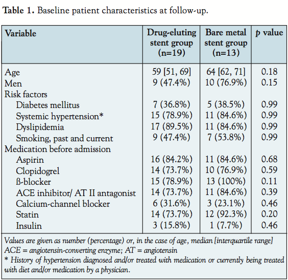 Baseline characteristics. Coronary risk factors were similar in both groups, (Table 1) including clinical indication for percutaneous coronary intervention at the time of the index procedure (Table 2). There was no difference in stent age between DES (median 38 [interquartile range, 7–59], minimum 3, maximum 66 months) vs. BMS (median 40 [interquartile range, 7–99], minimum 3, maximum 144 months), (p = 0.26). There was no difference in medication usage before admission between the 2 groups. Statins were used in 75% of DES-treated patients and in 90% of BMS-treated patients.