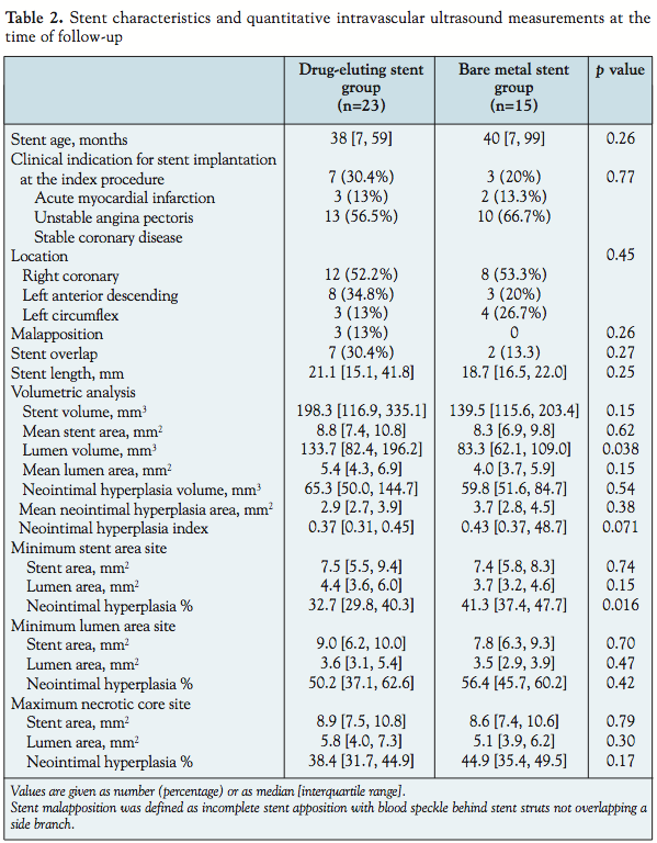 ABSTRACT: Background. The process of in-stent neointimal hyperplasia (NIH) between drug-eluting stents (DES) and bare metal stents (BMS) might be different. We compared in vivo composition of in-stent NIH between DES and BMS using virtual histology-intravascular ultrasound (VH-IVUS). Methods and Results. Volumetric VH-IVUS was used to compare in-stent NIH between 23 DES and 15 BMS in 30 patients who underwent coronary angiography because of angina. The inner and outer VH-IVUS contours were drawn in a way to avoid the stent strut artifacts. Cross-sectional analysis was done at every VH-IVUS frame within the stent, thereby allowing volumetric measurement of stent, lumen, and NIH and its components. Baseline characteristics and IVUS measurements were similar between DES and BMS groups. The duration of follow-up was similar between DES (median 38 months [interquartile range, 7–59]) vs. BMS (median 40 months [interquartile range, 7–99]), (p=0.26). % necrotic core (NC) volume was significantly higher in DES than BMS: 19.5 [16.3, 25.6] vs. 12.1 [8.2, 18.5] (p=0.006). %NC volume significantly increased with time in BMS (p=0.007), but not in DES (p=0.24) so that at any given time point, %NC in DES was greater than in BMS. After adjustment for baseline differences, only DES (p=0.003) and stent age (p=0.043) were independent predictors of %NC volume. VH-IVUS in-stent thin-cap fibroatheromas were detected only in the DES group: 34.8% vs. 0%, p=0.013. Conclusion. In vivo composition of in-stent NIH between DES and BMS was different, suggesting that the process of in-stent NIH in DES and BMS is diverse.