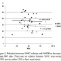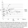 VH-IVUS findings. In early stage BMS (≤ 12 months, n = 7), most of the NIH was detected as fibrous or fibro-fatty, 90 ± 3.2%. Overall %necrotic core (NC) volume was significantly higher in DES than BMS: 19.5 [16.3, 25.6] vs. 12.1 [8.2, 18.5] (p = 0.006). There was no difference of VH-IVUS findings between overlapped and non-overlapped DES sites (Table 3). There was no relation between % NC versus the amount of NIH at the maximum NC site in DES or BMS (Figure 2).