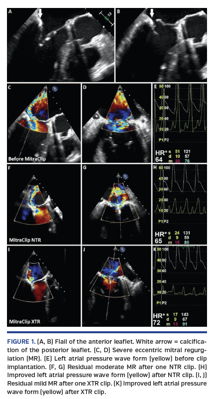 An 89-year-old man presented with dyspnea (New York Heart Association class IV). He had undergone coronary artery bypass graft and surgical aortic valve replacement. Transesophageal echocardiography (TEE) revealed severe mitral regurgitation (MR) with flail anterior leaflet, calcified posterior leaflet (Figures 1A-1D; Videos 1 and 2) and high left atrium pressure (LAP) (Figure 1E). Transcatheter edge-to-edge repair using the MitraClip (Abbott Vascular) was performed. Considering the calcified posterior leaflet, we chose NTR to avoid the leaflet damage. However, there was still moderate MR after we grasped the A2/P2 segments using one NTR clip (Figures 1F and 1G) with significant LAP improvement (Figure 1H; Video 3). We decided to retrieve the NTR and implanted an XTR clip in the same position. We then achieved better MR reduction without any leaflet damage (Figure 1I and 1J; Video 4) and further reduction of LAP (Figure 1K).