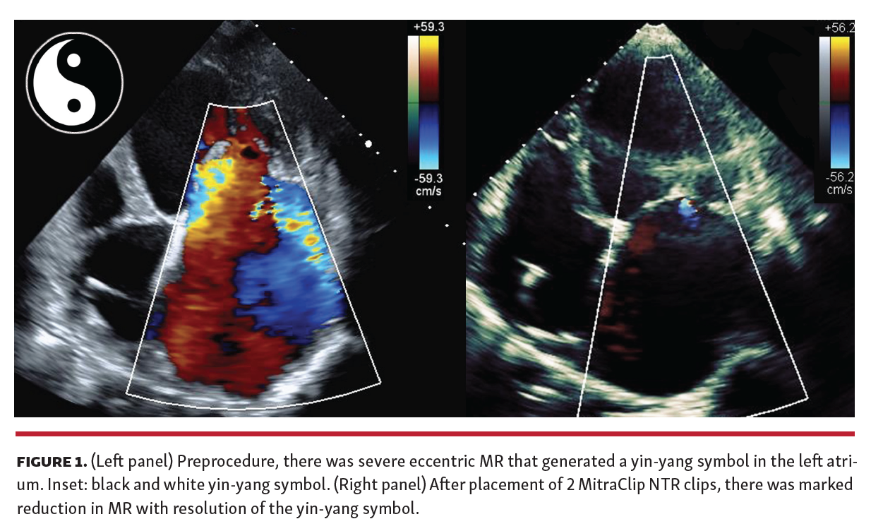 An 81-year-old woman with symptomatic, severe, functional MR secondary to non-ischemic cardiomyopathy was referred for transcatheter mitral valve repair. Her transthoracic echocardiogram (TTE) demonstrated ejection fraction of 35%, left ventricular end-systolic dimension of 6.41 cm, severe left atrial and mitral annular dilation, and 4+ eccentric MR that generated systolic pulmonary vein flow reversal and a prominent yin-yang symbol (Figure 1). Quantitative evaluation demonstrated effective regurgitant orifice area of 46 mm2 and regurgitant volume of 72 mL. After placement of 2 MitraClip NTR clips (Abbott Vascular) to the A2-P2 segment, there was significant reduction in the patient’s MR evidenced by resolution of the yin-yang sign and normal systolic pulmonary vein flow.