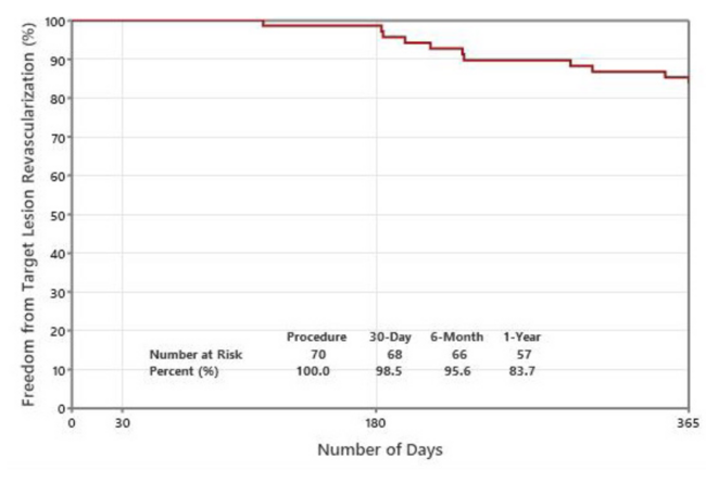 This study included 56 patients, of which 9 had procedures on both legs and 5 patients had 2 lesions on 1 leg. TLR rates were calculated by accumulating the TLRs through the period from baseline out of the number of procedures at risk at the beginning of the period following the index procedure. Statistical differences were also analyzed for ankle-brachial index (ABI) between baseline and 1 year. Analyses was performed per patient, per procedure, and per lesion. Kaplan-Meier survival analysis was performed to estimate the freedom from TLR rate following the index procedure. Statistical significance was determined by a P-value <.05. Analysis was performed with Minitab 2020 and Cytel 11 software.