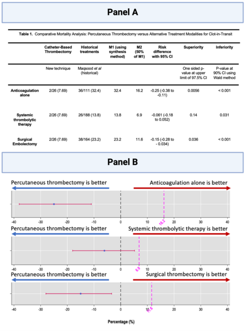 There was a total of 26 patients in the CBT group with a mean age of 59.3 ± 17.9 years; 42.3% were women and 57.7% were Black. A total of 463 patients from a prior published meta-analysis underwent alternative treatment strategies; the mean age of the patients included in the meta-analysis was 60.6 years, and 49.9% were women. The median time to intervention was 5.8 hours (interquartile range 4.1, 19.8 hours) in the CBT group. Short-term mortality in the CBT group was 2 out of 26 patients (7.7%), which was lower when compared with historical data of anticoagulation (36/111, 32.4%), ST (26/188, 13.8%) and surgical thrombectomy (38/164, 23.2%). Using the prespecified noninferiority margin for each treatment, CBT was found to be noninferior to anticoagulation alone (P-valueNI < .001), ST (P-valueNI = .031) and surgical thrombectomy (P-valueNI <0.001), and superior to anticoagulation alone (P = .0056) and surgical thrombectomy (P = .036, Figure)