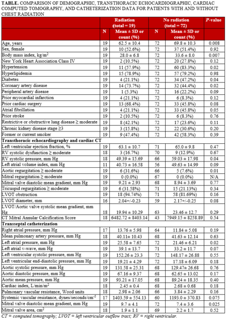 Mitral annular calcification (MAC) that extends into the leaflets is associated with mitral stenosis (MS).1 A definition of MAC-related MS was recently proposed as evidence of annular calcification with an elevated transmitral gradient (TMG).1 However, an elevated TMG can be driven not only by mitral stenosis, but also mitral regurgitation, diastolic dysfunction, and left atrial noncompliance. Each of these conditions is prevalent in chest radiation (CR) heart disease, making accurate non-invasive evaluation of suspected MAC-related MS challenging.2 Hemodynamic phenotypes in patients with MAC-related MS and CR remain poorly understood. We sought to explore the invasive hemodynamic parameters in patients with and without CR who had a diagnosis of MAC-related MS and underwent transseptal hemodynamic catheterization.