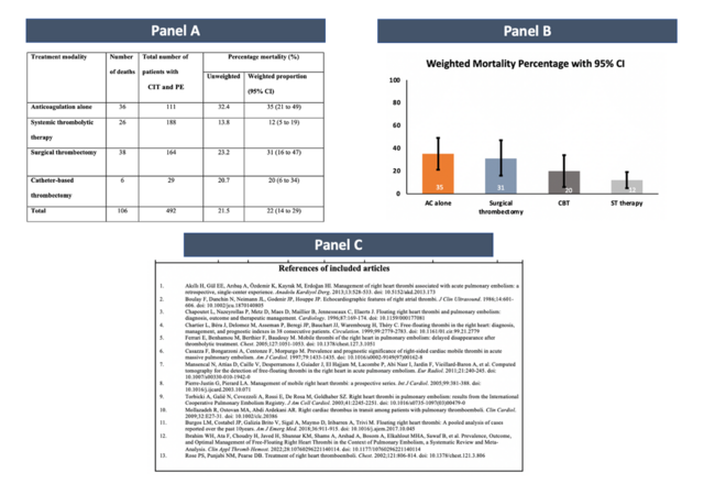 Clot-in-transit (CIT) in patients with pulmonary embolism (PE) has been associated with a high mortality rate and poor prognosis.1,2 Given the rarity of CIT and the paucity of available literature, the optimal treatment is still unknown. Currently, the 4 most frequently employed treatment modalities in patients with CIT and acute PE include anticoagulation (AC) alone, systemic thrombolytic (ST) therapy, surgical thrombectomy, and catheter-based thrombectomy (CBT), with the latter becoming increasingly common. The aim of this study was to evaluate the pooled efficacy of each of the 4 interventions using mortality as the primary outcome.