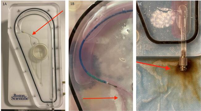 We tested both braided and coiled MCs (Table 1). The MC was kept in the same position during the 2 cycles. We evaluated the damage on the surface of the MCs visually and by camera zoom. We also tested the integrity of the MC wall by injecting saline to determine whether it was perforated.