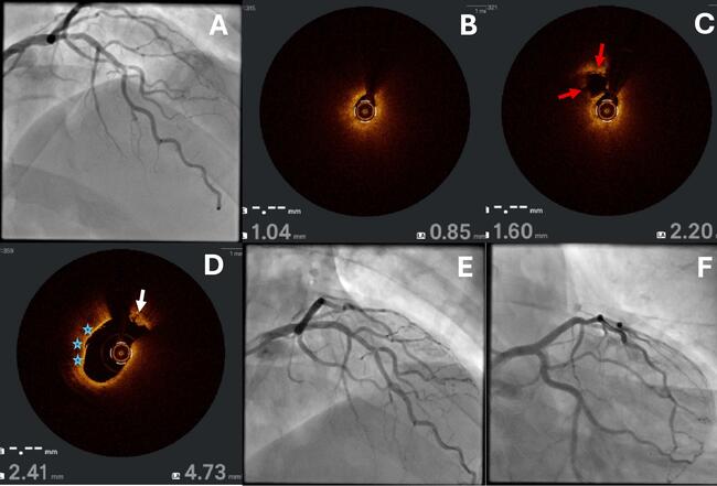 A 56-year-old man presenting with non-ST elevation myocardial infarction was found to have a severe stenosis in the proximal left anterior descending artery (LAD) on baseline angiography (Figure 1A; Video 1). OCT-guided PCI was planned, but flow was occlusive with the imaging catheter positioned distal to the lesion. The C-PUSH technique was performed without predilatation, demonstrating a heavy burden of lipidic plaque with a minimal lumen area (MLA) of 0.85 mm2, thin cap fibroatheroma, and plaque rupture (Figure 1B-D; Videos 2 and 3). Because of the plaque morphology, the lesion was directly stented with a 3.5 x 23-mm XIENCE Skypoint (Abbott) and post-dilated with a 4.0-mm noncompliant balloon. Final angiographic and OCT images are shown in Figure 1E and 1F and Video 4, respectively.