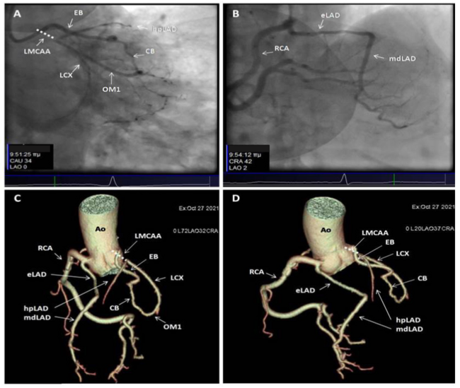 A 75-year-old woman was referred to our center for coronary angiography (CA) due to atypical chest discomfort unrelated to exertion and accompanying coronary artery disease risk factors (hypertension, type 2 diabetes, former smoker). CA was unremarkable for significant stenosis, but revealed complex anatomic anomalies. Left coronary artery system cannulation (Figure 1A and Video 1) illustrated a 75-year proved-to-be nonfatal, left main coronary artery atresia (LMCAA) and bifurcation to the left circumflex (LCX) and a hypoplastic proximal left anterior descending artery (hpLAD). An ectopic branch (EB) originated from the left coronary sinus and retrogradely supplied the LCX through the first obtuse marginal (OM1) by a coronary bridge (CB). The right coronary artery (RCA) catheterization (Figure 1B and Video 2) depicted a dominant RCA and, unexpectedly, an ectopic LAD (eLAD) originating from the proximal RCA; in other words, an anomalous coronary artery from the opposite sinus (ACAOS). The eLAD coursed obliquely to the left, exhibiting an intraseptal route (resembling the anomalous septal course of the LMCA originating from the right coronary sinus) and continued as mid-distal LAD, heading down to the anterior interventricular sulcus (note the septal branches throughout the vessel course). Coronary computed tomography angiography (CCTA) deciphered the 3-dimensional path of her coronary tree (Figures 1C, 1D).