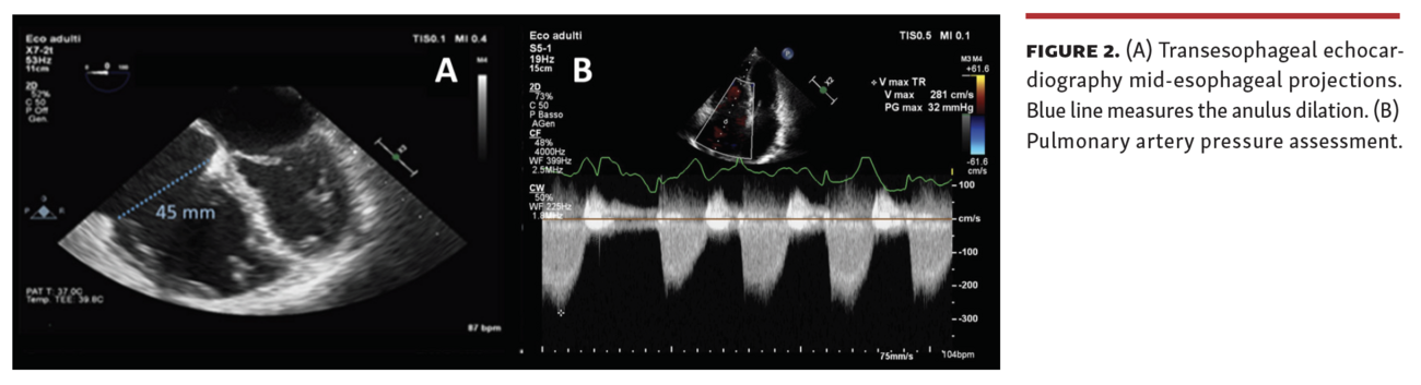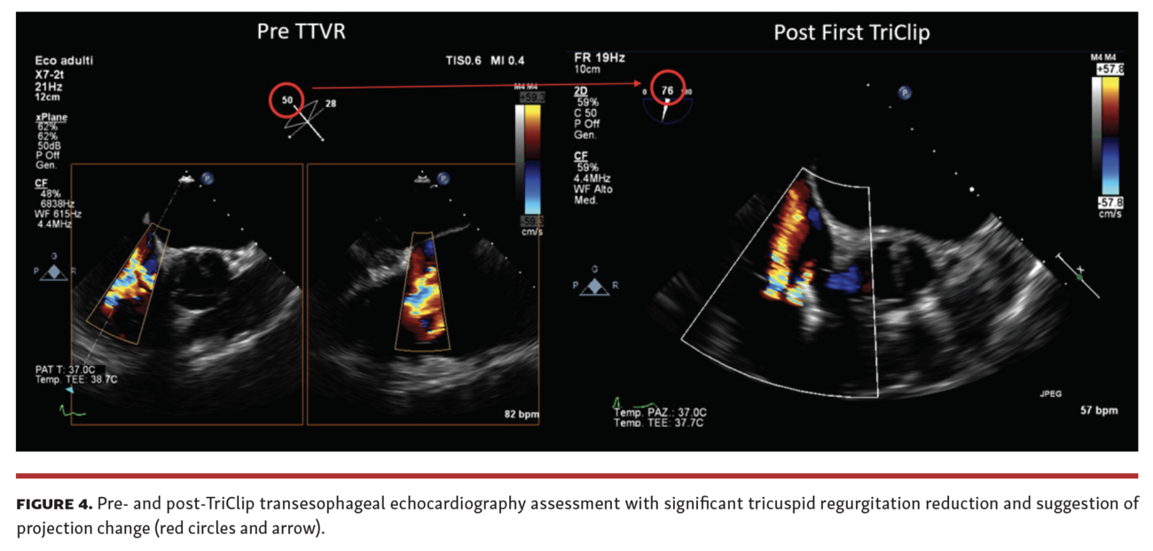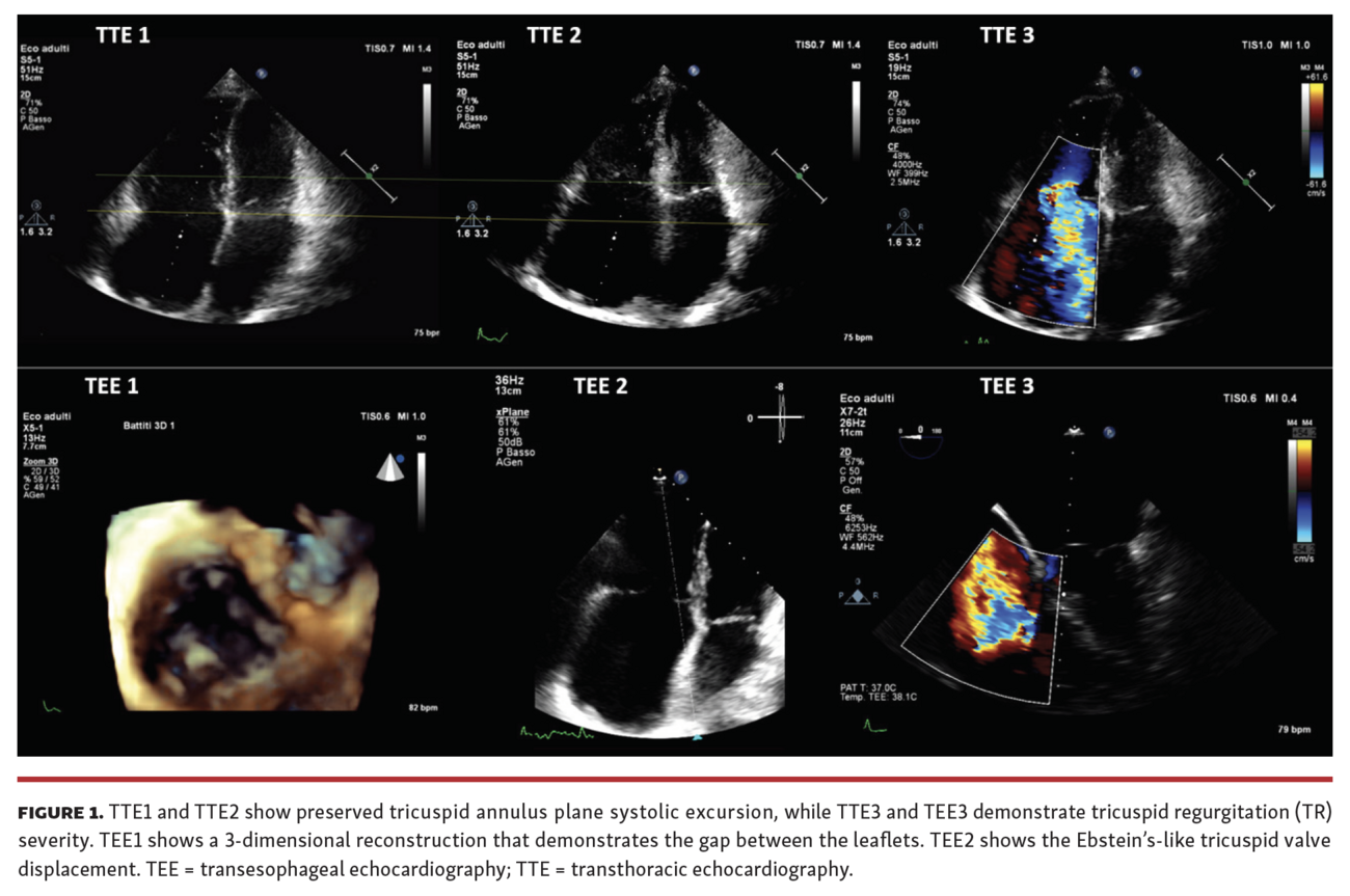 The efficacy of transcatheter edge-to-edge tricuspid valve repair (TTVR) has been recently demonstrated not only for the reduction of tricuspid regurgitation (TR) but also in terms of right ventricular remodeling. We report the case of a 78-year-old female patient with a history of atrial fibrillation and severe isolated TR in New York Heart Association functional classification III despite optimal medical therapy. The preprocedural transesophageal echocardiography (TEE) showed severe TR associated with Ebstein’s-like valve displacement, and dilation of the right atrium and ventricle with “atrialized” portion. The tricuspid annulus plane systolic excursion was preserved (20 mm) with acceptable systolic pulmonary artery pressure (PAP) of 30 mmHg (Figure 1 and Figure 2; Video Series).