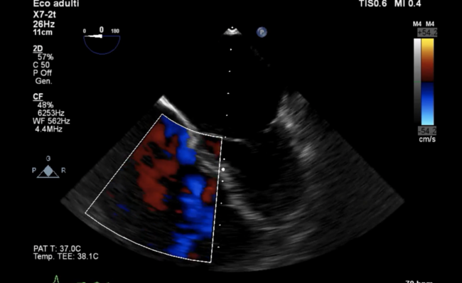 The preprocedural cardiac magnetic resonance (CMR) showed a right ventricular end-diastolic volume index (RVEDi) of 79 mL/m2, right ventricular end-systolic volume index (RVESi) of 27 mL/m2, tricuspid regurgitant volume (TRV) of 56 mL, and tricuspid regurgitant fraction (TRF) of 67% (Figure 3). Due to the patient's history of breast cancer radiotherapy and high surgical risk, the heart team preferred a transcatheter approach as the treatment option. The first TriClip (Abbott Vascular) was successfully implanted in the anteroseptal commissure, determining annulus size reduction and the subsequent necessity of transesophageal echocardiographic projection change to assess the result due to acute reshaping (Figure 4 and Figure 5; Video Series). A second TriClip was implanted in the anteroseptal commissure, highlighting the changes in the valvular plane and cardiac axis (Video Series). Residual TR was trivial (Video Series). The acute remodeling was confirmed at the CMR follow-up (Figure 6), with significant volume and TR reductions (RVEDi, 39 mL/m2; RVESi, 18 mL/m2; TRV, 8 mL; and TRF, 23%).