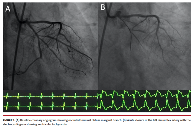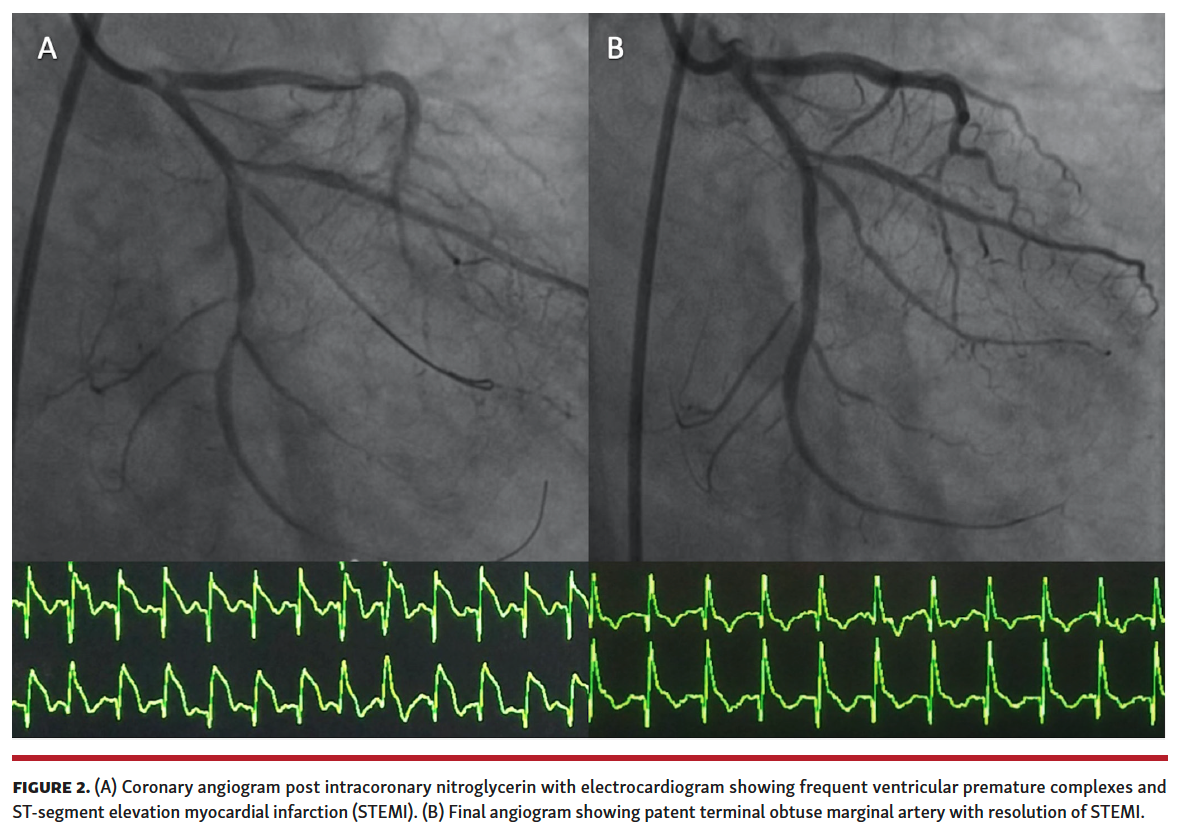 A 45-year-old man presented with complaints of chest pain for 6 hours. Electrocardiogram was suggestive of inferior wall ST-segment elevation myocardial infarction (STEMI). The patient did not approve primary percutaneous coronary intervention (PCI) and was thrombolyzed with tenecteplase. However, there was no relief in chest pain and the patient developed cardiogenic shock. He was taken for rescue PCI. Left coronary angiogram showed complete thrombotic occlusion of the terminal obtuse marginal branch (Figure 1A; Video 1). The left circumflex artery was crossed with Runthrough extra floppy NS guidewire (Terumo). The patient developed worsening ST elevation and ventricular tachycardia, which was cardioverted by giving 2 shocks of 200 J. Left coronary angiogram showed occlusion of the left circumflex artery (LCX), right from the ostia (Figure 1B; Video 2). We initially thought of thrombus migration as the cause of acute vessel closure. Initially, dottering and subsequent dilation of the left circumflex was done with a 2.0 x 10 mm semicompliant balloon. The activated clotting time was 356 seconds. There was not much improvement in the blood flow in the LCX. We suspected coronary spasm and gave multiple 50 µg boluses of intracoronary nitroglycerin. Subsequently, brisk flow was established in the LCX (Figure 2; Video 3). The lesion was stented with a 2.75 x 18 mm everolimus-eluting stent. ST-segment changes settled after the PCI.
