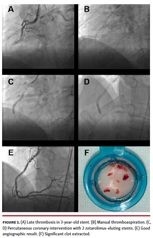 Coronary angiography showed acute occlusion of middle RCA due to “very late” thrombosis in the 3-year-old stent (Figure 1A). In consideration of suspected high thrombotic burden in this peculiar clinical setting, we decided to perform manual thromboaspiration (Figure 1B) with significant clot extraction (Figure 1F). PCI was completed with 2 zotarolimus-eluting stents (Figure 1C and 1D) and good angiographic result (Thrombolysis in Myocardial Infarction flow 3) (Figure 1E). Unfractionated heparin (6000 U) was administered before the PCI, followed by glycoprotein IIb/IIIa inhibitor (tirofiban) in consideration of high thrombotic burden. A ticagrelor loading dose (180 mg) was administered after guide-catheter removal.