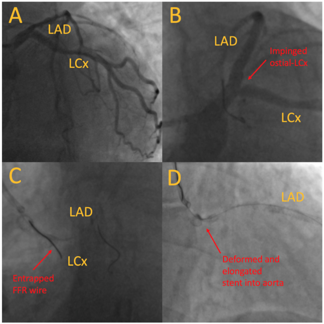 A 59-year-old female was admitted for non-ST-elevation myocardial infarction (NSTEMI) and Killip class 3 heart failure. Echocardiogram showed left ventricular ejection fraction (LVEF) of 30%. Coronary angiogram showed moderate to severe stenosis over the ostial-proximal left anterior descending artery (LAD) (Figure 1A), with minor disease over the left circumflex artery (LCx) and right coronary artery (RCA). Fractional flow reserve (FFR) and instantaneous wave-free ratio (iFR) performed across the LAD lesion were 0.78 and 0.86, respectively. The FFR wire was then parked at the LCx for side branch protection. Intravascular ultrasound (IVUS) showed significant disease over the distal left main (LM) to the mid-LAD. IVUS-guided provisional stenting of the LM-LAD was performed with 2 overlapping drug-eluting stents. The final angiogram showed an impinged ostial LCx (Figure 1B), used for functional study. The jailed FFR wire at the LCx removed and attempted to recross the pinched LCx, but was trapped at the proximal LCx, unable to be advanced or pulled (Figure 1C). The wire was removed with difficulty after numerous attempts, with microcatheter and coronary balloon assistance. However, it resulted in severely deformed and elongated stents, with long segment protrusion into the aorta (Figure 1D). “Ping-pong” guiding with a 9-Fr JL4 via right femoral artery was performed. Distorted stents were wired in and out of stent struts intentionally with 3 guidewires via the new JL4, intending to remove the stents with a twisted wire technique, but failed (Figure 2A;Video 1).