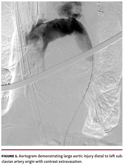 A 95-year-old man with severe symptomatic aortic stenosis was admitted for elective transcatheter aortic valve replacement (TAVR). He had balloon aortic valvuloplasty 1 year prior with aortic valve restenosis resulting in dyspnea on minimal exertion. The patient pursued TAVR for improvement in quality of life. His preprocedure computed tomography (CT) scan demonstrated moderate aortic and iliofemoral atherosclerosis. TAVR was performed in a hybrid theater with bilateral femoral arterial access. After crossing the aortic valve and recording peak-to-peak aortic valve gradient of 48 mm Hg, a stiff wire was placed in the left ventricle. The valve delivery system was passed over this, but would not easily cross the aortic arch. The patient became distressed and hypotensive. The aortogram demonstrated large aortic injury distal to the left subclavian artery origin with significant extravasation (Figure 1 and Video 1). The patient had pulseless electrical activity. Despite cardiopulmonary resuscitation, rapid blood transfusion, and covered stenting of aortic injury, the patient did not survive.