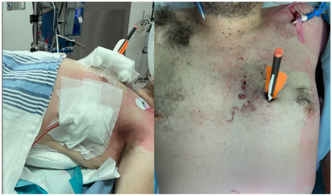 A 54-year-old man suffered a self-inflicted penetrating chest wound from an automated crossbow used for hunting large animals (Figure 1), with an entrance wound in the left third intercostal space and an exit wound at the tenth intercostal space (Figure 2). The arrow was in the plane of the diaphragm and penetrated the left ventricle (LV), although no hemopericardium, hemothorax, or pneumothorax were identified. Intraoperative transesophageal echocardiography showed no significant mitral regurgitation despite the proximity of the arrow to the base of a papillary muscle (Figure 2; Videos 1 and 2).