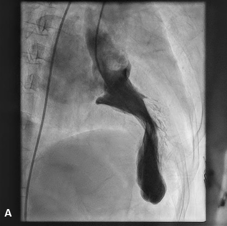 After obtaining informed consent, the patient was taken up for a left heart catheterization and coronary angiography to look for an appropriate septal branch for alcohol septal ablation. The left ventricular systolic pressure was significantly elevated (LVESP 250 mm Hg) and the left ventricle (LV)-to-aorta pullback showed an intracavitary gradient of 140 mm Hg, with no left ventricular outflow tract (LVOT)-to-aorta gradient. The LV angiogram showed the “ballerina foot deformity”, which represents the asymmetrical septal hypertrophy with LV hypercontractility; and severe mitral annular calcification with grade 3 mitral regurgitation (Figure, Videos 1 and 2). Her coronary angiography revealed a significant obstructive disease in the mid-left anterior descending artery (LAD), while the rest of the vessels were normal. After discussion with the heart team, she was taken up for alcohol septal ablation, which successfully decreased the LVOTO gradient to 25 mm Hg. Subsequently, percutaneous coronary angioplasty to the LAD was done successfully and the patient was discharged with significant symptomatic relief.