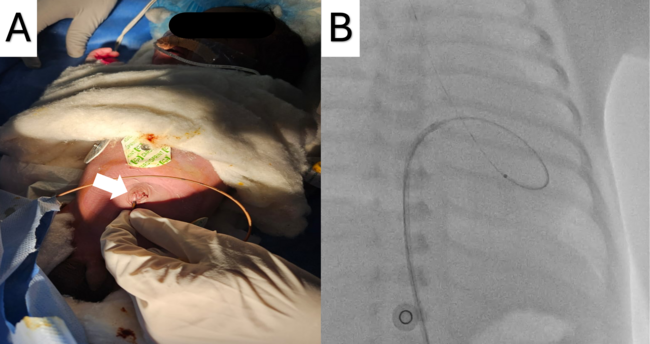 After obtaining informed consent from the parents, the neonate was planned for balloon aortic valvuloplasty (BAV) via the umbilical vein, which had been preserved by inserting a small 4F catheter (Figure A). A 0.014-inch regular workhorse percutaneous transluminal coronary angioplasty (PTCA) wire was inserted and advanced via the umbilical vein through the ductus venosus into the inferior vena cava to the right atrium (RA) (Video 1). Because of a lack of wire support, further advancement was not possible without catheter assistance. A 4F catheter was upgraded to a 5F sheath and a 5F right coronary artery catheter was advanced until it reached the RA. The wire was then manipulated and advanced into the left atrium and subsequently into the left ventricle (LV) through the patent foramen ovale (Video 2). An attempt to cross the aortic valve (AV) with the wire failed because of inadequate support. A Renegrade microcatheter (Boston Scientific) was introduced into the LV (Figure B); the AV was successfully crossed and the PTCA wire was parked in the descending aorta (Video 3). Following microcatheter removal, BAV was performed traditionally with a 4 x12-mm coronary angioplasty balloon, as the annulus measured approximately 6 mm. The post-procedural echocardiographic peak gradient was 18 mm Hg, and the procedure time lasted approximately 1 hour. The plan was to do a repeat BAV from the femoral route 1 month post-procedure.
