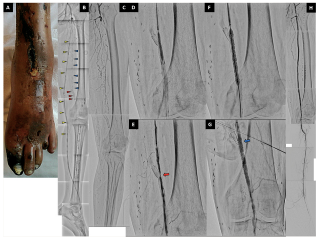 A 57-year-old woman with critical limb-threatening ischemia (CLTI) of the left lower leg underwent endovascular therapy (Figure 1A). She had undergone a femoropopliteal (F-P) bypass for treatment of chronic total occlusion (CTO) of the superficial femoral artery (SFA) four years prior. However, its occlusion occurred. Thus, a self-expandable stent was placed at the F-P bypass anastomosis three years previously. Nevertheless, the F-P bypass occluded, and CLTI recurred. Therefore, distal bypass (common femoral artery [CFA] – anterior tibial artery [ATA]) was performed one year prior (Figure 1B).