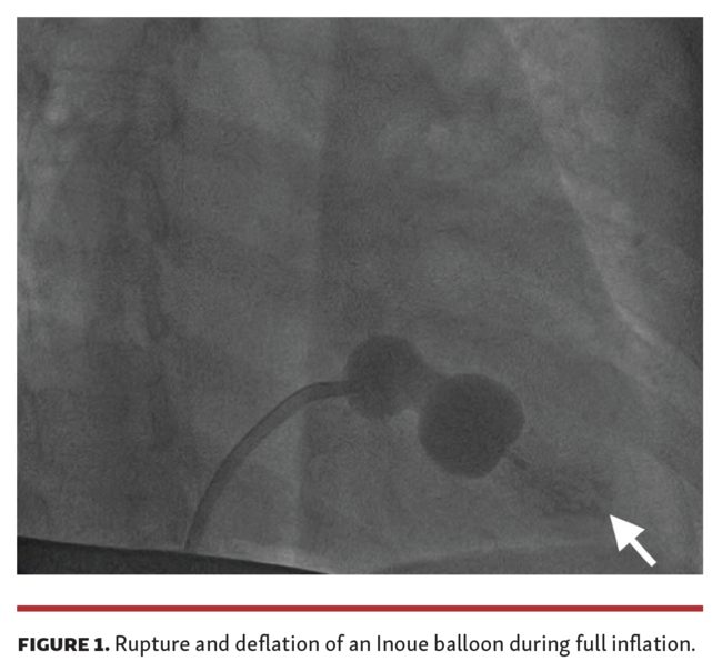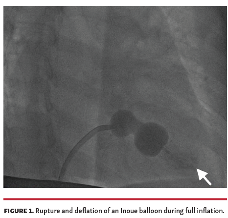 The Inoue balloon catheter is made from polyvinyl chloride, and has a 3-layered balloon with a polyester micromesh layer between the 2 latex layers. The blood can enter the space between the latex layers and become embedded in the mesh layer, which is difficult to clean during resterilization. This is a common cause of rupture. The reuse of sterilized Inoue catheters is practiced widely in developing countries to bring down the procedure cost. Proper meticulous inspection of reused Inoue balloons for deformity or leakage through the small holes is necessary to prevent such complications.