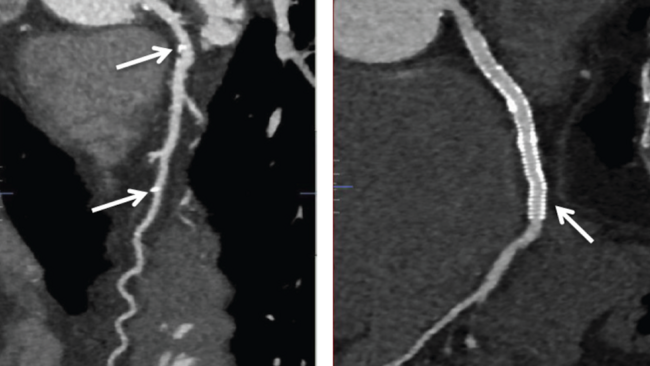 A 72-year-old gentleman presented with angina. He had previously undergone percutaneous coronary intervention (PCI) to the right coronary artery and left circumflex artery (LCX) with drug-eluting stents. Coronary angiography revealed a long segment of moderate stenosis in the proximal to mid left anterior descending artery (LAD) (Figure 1A). This was treated with Absorb bioresorbable vascular scaffolds (BVS; Abbott Vascular) (Figure 1B) with the use of intravascular ultrasound to confirm adequate stent expansion. He represented 5 years after his PCI with atypical symptoms. A computed tomography coronary angiogram showed the BVS were no longer visible and only the platinum markers were seen (Figure 1C). The scaffolds had been completely reabsorbed, allowing the use of non-invasive imaging to obtain high-quality diagnostic images not affected by artefact, as seen with the DES in the LCX (Figure 1D) preventing the vessel being assessed with the same clarity.
