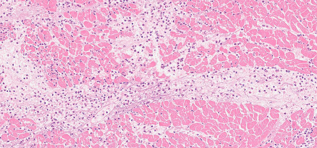 Due to a sudden deterioration of the patient’s hemodynamic parameters, an under-xiphoid pericardiocentesis was attempted with blood removal; however, the patient died immediately upon the attempt. The autopsy clearly demonstrated that an anterior left ventricle free-wall rupture was the cause of death (Figure 2). Long-axis cut of the heart revealed a cardiac laceration in the context of a necrotic-hemorrhagic infarction, as per transmural necrosis (Figures 3 and 4). Coronary inspection confirmed the vessels’ patency. Hematoxylin and eosin staining showed a massive transmural interstitial neutrophilic infiltrate (Figure 5); the neutrophils displaced the disarranged cardiomyocytes, exhibiting loss of the nucleus and hypereosinophilic cytoplasm with a lack of striations (Figure 6).