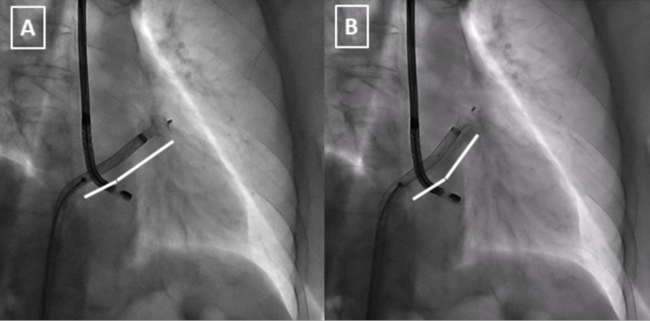 Left atrial appendage (LAA) occlusion has emerged as an alternative to oral anticoagulation in non-valvular atrial fibrillation. The success rate is high, but we are still facing some challenging LAA anatomies that may increase the risk of suboptimal results. Coaxiality between the delivery sheath and the LAA neck is therefore crucial. Nevertheless, even with an optimal transseptal puncture, some LAA morphologies imply some difficulties. The novel Amplatzer steerable delivery sheath (Abbott Cardiovascular) offers the possibility of deflecting the distal end in a wide spectrum of angles from 0º to 120º (Figure 1). This could be determinant to achieving a final coaxial position with the neck during the deployment and improving the rate of complete occlusion.