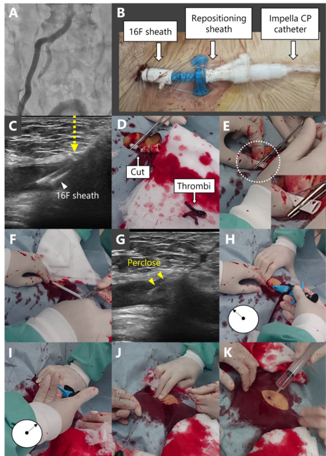 Two days later, the Impella was weaned with a post-closure technique using Perclose devices (Abbott) at bedside per the following procedure. First, we removed the Impella, leaving the 16-Fr sheath in place. We verified the accurate sheath insertion point by ultrasound to optimize manual compression (Figure C, yellow arrow). Next, we cut the sheath-shaft to remove intra-sheath thrombi (Figure D) and directly punctured the remaining sheath-shaft to insert a guidewire (Figure E). While 1 operator was manually compressing, another removed the sheath (Figure F) and inserted the Perclose. The Perclose was properly positioned within the artery (Figure G) and deployed in the 10 o’clock direction (Figure H). The guidewire was reinserted, and the second Perclose was likewise deployed in the 2 o’clock direction (Figure I). Then, both knots were tightened (Figure J). We carefully confirmed no residual bleeds/dissection/occlusion by ultrasound. Finally, we removed the guidewire and trimmed the extra threads (Figure K). The patient experienced no vascular complications during hospitalization.