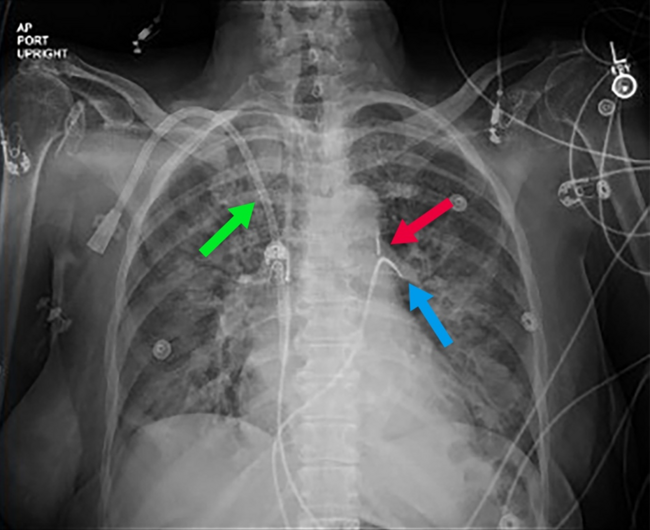 An 80-year-old woman with severe aortic stenosis, end-stage renal disease with a poorly functional left forearm arteriovenous fistula (flow 132-336 mL/min; normal 500-1500 mL/min), and a recently placed right internal jugular vein tunneled dialysis catheter presented with chest pain, shortness of breath, new left bundle branch block, and hypotension (87/51 mm Hg). Her labs were notable for a high-sensitivity troponin level greater than 60 000 ng/L, (normal: < 52 ng/L), a white blood cell count of 18 000 (normal: 4.00-11.00 x10(9)/L), and a lactate level of 3.0 (normal: 0.5-2.2 mmol/L).