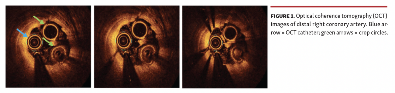 A 57-year-old woman with a history of idiopathic thrombo- cytopenia presented with chest pain and inferior ST-segment elevation myocardial infarction following percutaneous coronary intervention to a distal right coronary artery (RCA) stenosis. A right femoral artery angiogram showed an acute stent thrombosis. After blood flow was restored with intracoronary thrombectomy and balloon angioplasty, optical coherence tomography (OCT) was performed using DragonFly Optis (Abbott Vascular). Unfortunately, it was difficult to advance the catheter beyond the stented segment. On review of the image, there were 2 circular figures resembling “crop circles” extending proximally for several frames (Figure 1).