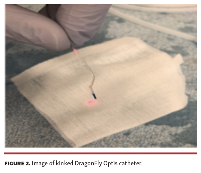 On removal of the catheter, there were 2 kinks on the distal, soft translucent segment of the catheter distal to the lens marker that caused it to fold onto itself and produce the unusual image (Figure 2). This most likely resulted from failed attempts to deliver the DragonFly Optis catheter through the distal RCA stent into a small-caliber right posterior descending artery. In the future, the DragonFly Opstar imaging catheter may reduce the risk of distal catheter kink with a shorter lens-to-tip distance (23 mm compared with 27 mm).