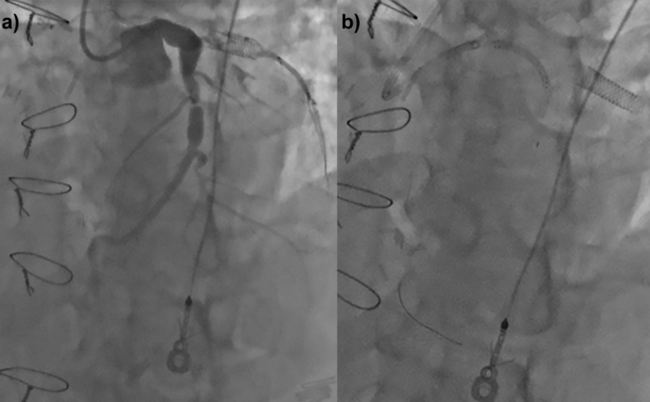 A patient with occluded bypass grafts underwent intervention for persistent angina. His left anterior descending artery was ectatic with severe mid-vessel disease (Figure 3a). A balloon-expanding 7.0- x 27-mm peripheral stent was dislodged off the balloon, proximal to the lesion, and could not be advanced (Figure 3b). It could not be deployed as it extended into the aorta. Another guidewire was placed through the struts and a 20-mm Amplatz Goose Neck snare (Medtronic) was advanced over both wires outside of the body to presnare. The snare was navigated around the stent (Figure 3c) and it was withdrawn (Figure 3d). The procedure was terminated (Video Series).
