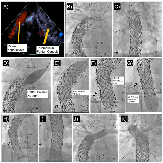 Repeat angiogram demonstrated a widely patent FC conduit and LPA stent with no residual gradient from IVC to the SVC (Figure, H-K). This case highlights the role of percutaneous rehabilitation in the setting of acute thrombotic occlusion of an FC, an etiology historically felt to be lethal.
