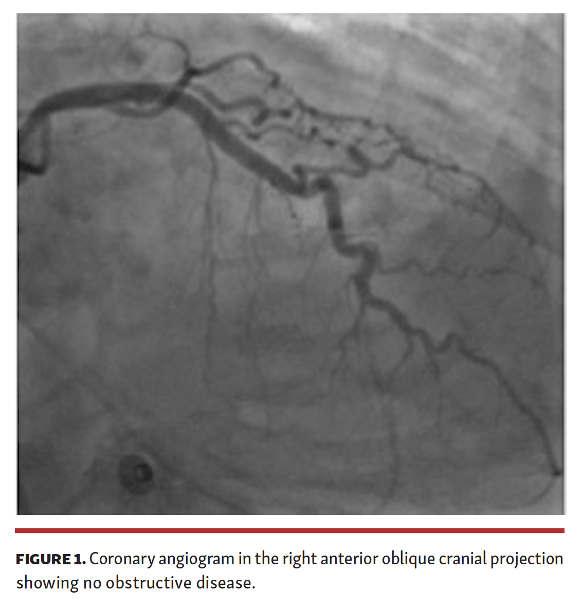 A 49-year-old female patient presented with progressive shortness of breath, and abdominal and leg swelling. Her medical history was significant for stage 3 breast cancer, which was treated with multiple rounds of chemotherapy and radiation over 7 years. Electrocardiogram showed Q-waves in V1 and V2. Bedside echocardiogram showed a left ventricular ejection fraction of 25% with severe global hypokinesis. Troponin I was elevated at 1.15 ng/mL. She was taken to the cardiac catheterization lab, where a coronary angiogram showed no obstructive coronary artery disease (Figure 1), but revealed an unusual motion abnormality of the coronary arteries that is typical for pericardial constriction (Videos 1 and 2). The pericardium was unremarkable on fluoroscopy. Subsequent echocardiography revealed other signs of constrictive pericarditis with thickened pericardium, interventricular interdependence, and annulus reversus (lateral e' velocity < medical e' velocity).