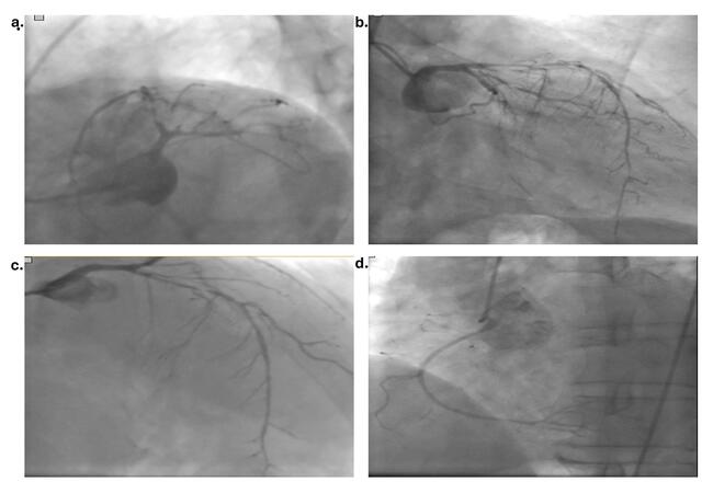 The patient was offered bypass surgery at another hospital and, after he refused, was admitted to our hospital. The patient received intravenous nitrate therapy for 4 to 6 hours after coronary angiography. He was also receiving atorvastatin, acetylsalicylic acid, metoprolol, perindopril, and enoxaparin therapy. The patient again did not accept bypass surgery; however, 48 hours later, he agreed to undergo coronary angiography for percutaneous intervention. Coronary angiography showed no critical stenosis in the LAD or Cx. There was only plaque in the LAD, and medical follow-up was planned (Figure 3) (Video 2). His cTnI value increased to 3600 ng/mL and dropped to 1000 ng/mL before discharge. There was no change in the ECG (Video 3). The patient was questioned again about drug or substance use, but he stated that he had not used anything. The blood or urine tests were not performed for substance use. The patient was discharged with atorvastatin, acetylsalicylic acid, clopidogrel, amlodipine, perindopril, and nebivolol therapy.