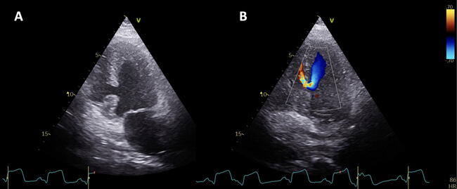 Since the introduction of primary percutaneous intervention and immediate reperfusion, the incidence of ventricular septal rupture has decreased to less than 1%.1 However, the mortality rates from this rare mechanical complication remain very high, ranging from 40% to 80% within the first month.2 The presence of cardiogenic shock in a patient with myocardial infarction and preserved ejection fraction, combined with the characteristic holosystolic murmur over the precordium, are key indicators for the diagnosis.