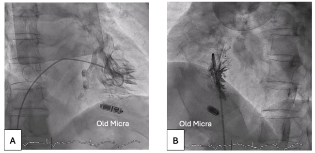 A new Micra AV implantation was planned. Given the patient’s relatively young age, the goal was to achieve the lowest possible pacing threshold while avoiding multiple deployments that could dislodge the existing device.