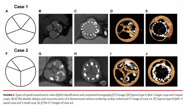 Case #1. A 79-year-old man was admitted to the hospital for severe aortic stenosis and moderate aortic regurgitation. A 4-leaflet, which was classified as a type E quadricuspid aortic valve (QAV),1 was found during the analysis of contrast-enhanced computed tomography (CT) images (Figures 1A, 1B, 1D). Transcatheter aortic valve replacement (TAVR) was then successfully performed with a 23 mm Venus A valve (Medtech). No abnormality of prosthesis was found at annual CT examination (Figures 1C, 1E). No major adverse cardiovascular events occurred during 5 years of follow-up until now.