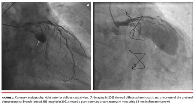Key words: angina, computed tomography coronary angiography, coronary artery aneurysm, giant coronary aneurysm, pericardial tamponade, rupture, thrombosis