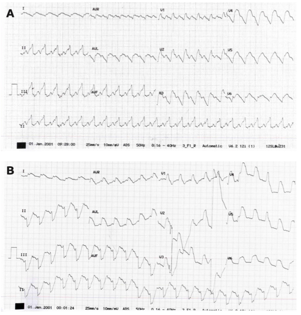A 55-year-old Thai man with history of chronic alcoholism presented to our hospital complaining of sudden onset of severe substernal chest pain and profuse sweating for 4 hours. Upon arrival, he was barely conscious. His initial blood pressure was 50/42 mm Hg. He became unresponsive and an electrocardiogram (ECG) showed wide complex tachycardia with the rate of 160 bpm. After successful cardiopulmonary resuscitation, the next ECG revealed sinus tachycardia with ST-segment elevation in lateral and anterior chest leads (Figure 1).