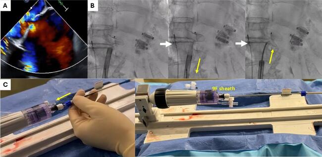 Post-procedure, a 1.2-cm iASD with a bidirectional shunt and oxygen desaturation was identified. Urgent closure was performed using a 22-mm Amplatz ASD occluder (Abbott). The PASCAL guiding sheath was re-crossed to the left atrium using a dilator over an Amplatz Super Stiff wire (Boston Scientific). After removing the dilator and wire, a 9F femoral sheath was advanced into the guiding sheath to pass its sealing valve. The 22-mm Amplatz ASD device was then loaded into the 9F sheath and advanced; the loader was subsequently removed.